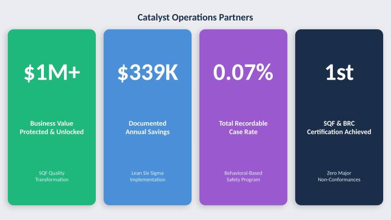 Led full SQF certification transformation for a mid-sized packaging manufacturer, rebuilding quality systems from the ground up following consecutive audit failures; achieved clean certification with zero major non-conformances and two minor findings, protecting $500K in annual customer revenue and positioning the client to win new business using certification as a competitive differentiator